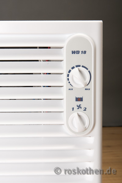 Regler am WD 18 - Hygrostat oben und Lüfterregelung untenNach dem Entfernen von einer Transportsicherung hinten am Gerät und dem Entfernen eines Tuches zur Aufnahme von Restfeuchtigkeit nach dem Testbetrieb des Herstellers (alle Hinweise waren gut auf entsprechenden Zetteln zu lesen), las ich die Bedienungsanleitung und mir wurde schnell klar, dass das Gerät simpel zu bedienen ist. Man kann den Wasserbehälter einsetzen oder einen Abwasserschlauch anschließen (sehr praktisch in Kellern mit Abflüssen). Dann stellt man das Gerät auf Stufe Zwei  (beste Energieeffizienz – die Stufe Eins dient dem geräuscharmen Betrieb während man im Raum ist) und lässt es laufen, bis man die gewünschte Raumluftfeuchtigkeit erreicht hat. Ich habe bei 55% Luftfeuchtigkeit den zweiten Regler am Gerät langsam so weit zurück gedreht, bis das Gerät ausging. Danach spring der WD 18 immer dann an, wenn die Luftfeuchtigkeit sich erhöht (eingebauter Hygrostat) und wieder aus, wenn es die Luftfeuchtigkeit auf 55% reduziert hat. Sehr praktisch ist das schon deshalb, weil auch ein Stromausfall das Gerät, nach wieder vorhandenem Strom genauso läuft wie zuvor.