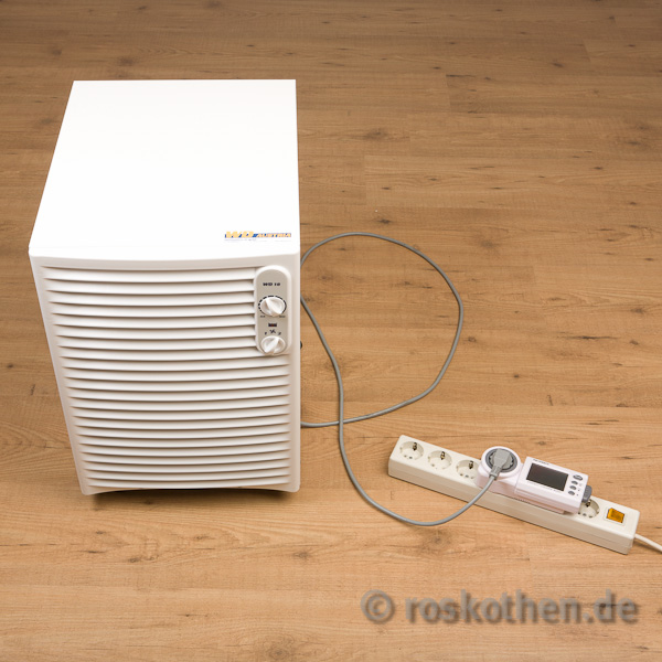 Stromverbrauch WD 18Fest steht, dass das Gerät hier in zwei durchschnittlich warmen Tagen (20 Grad) etwa 1.9 Liter bei einem hochgerechneten monatlichen Verbrauch von EUR 6,99 (bei 22 Cent pro KWh) und einem jährlichen Verbrauch von hochgerechnet EUR 85, 05. Dies wurde gemessen in zwei verbundenen Kellerräumen mit insgesamt 25,33qm und etwa 65 Kubikmetern Raum bei 18 Grad Celsius. Die vorherige Luftfeuchtigkeit lag bei etwa 65% und die neue Luftfeuchtigkeit mit dem HD 18 bei 53%. Ich habe den WD 18 jetzt auf 53% eingestellt (Hydrostat).